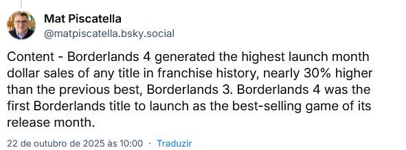 Mat Piscatella comentou em seu perfil na plataforma bsky que Borderlands 4 superou o jogo anterior da franquia em 30%, mas não apresentou números oficiais. Confira abaixo: