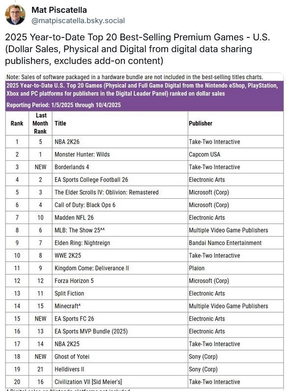 Ele também divulgou a lista com os 20 jogos mais vendidos até o momento nos EUA. Segundo ele, foram somadas as vendas físicas e digitais. Em primeiro lugar está NBA 2K26, em segundo Monster Hunter: Wilds e em terceiro Borderlands 4.