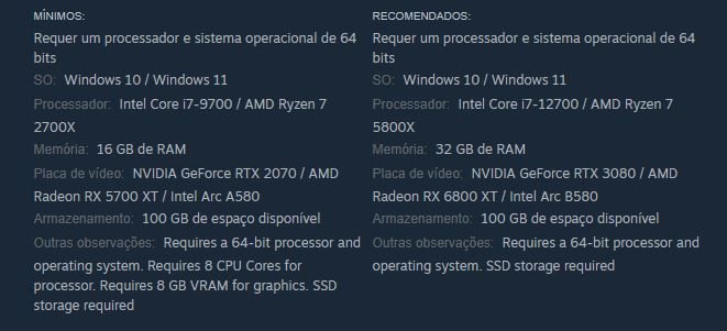 Realmente para jogar Borderlands 4 é preciso ter uma máquina razoável com um processador parecido com Intel Core i7-9700 ou AMD Ryzen 7 2700X, 16 GB RAM e uma placa de vídeo equivalente a uma NVIDIA GeForce RTX 2070 ou AMD Radeon RX 5700 XT.