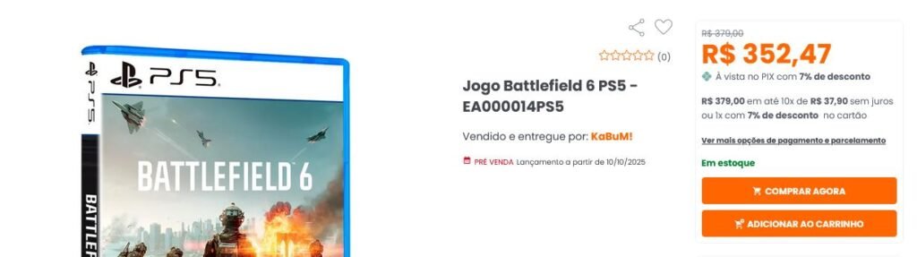 Na loja abaixo e edição física de Battlefield 6 está sendo vendida por R$ 352,47 no Pix ou em até 10x de R$ 37,90 sem juros.
