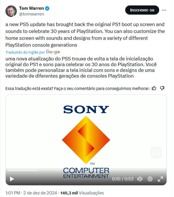 Amanhã (03) o PlayStation 1 celebra 30 anos, e como parte da comemoração a Sony lançou uma atualização para PlayStation 5 que adiciona um tema inspirado do primeiro console juntamente com sons.