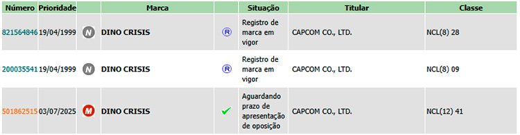 Agora de acordo com a página wccftech, a CAPCOM também registrou a marca Dino Crisis no Instituto Nacional da Propriedade Industrial (INPI) do Brasil em 03 de julho de 2025. Repare na imagem abaixo que é realmente um registro novo do jogo, o antigo é de 19 de abril de 1999.