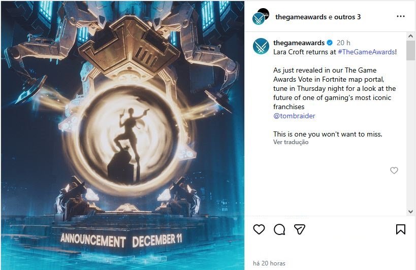 A confirmação veio através de uma postagem feita na conta oficial do The Game Awards. Eles postaram uma imagem com Lara Croft dentro de um portal e a data 11 de dezembro. Confira abaixo: