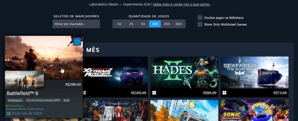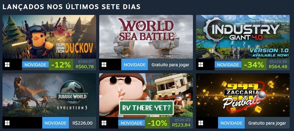 Ao passar o mouse sobre a capa de algum jogo é possível ver alguns detalhes sobre ele. São apresentadas as categorias em que ele faz parte, um pequeno vídeo, o número de análises positivas e o preço.
