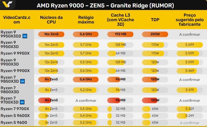 • Ryzen 7 9700X3D – 120W, 8 núcleos/16 threads, 96 MB de cache L3 – Apareceu no PassMark