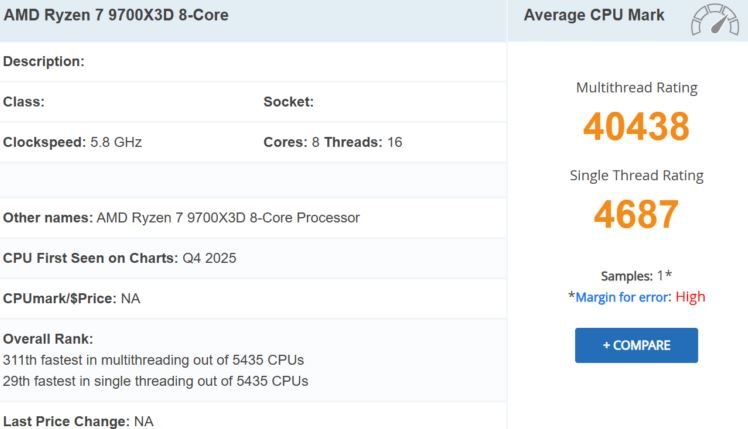 Se as informações do PassMark sobre o AMD Ryzen 7 9700X3D forem verdadeiras, ele superou o clock do AMD Ryzen 7 9800X3D que é de 5.2GHz. Confira abaixo: