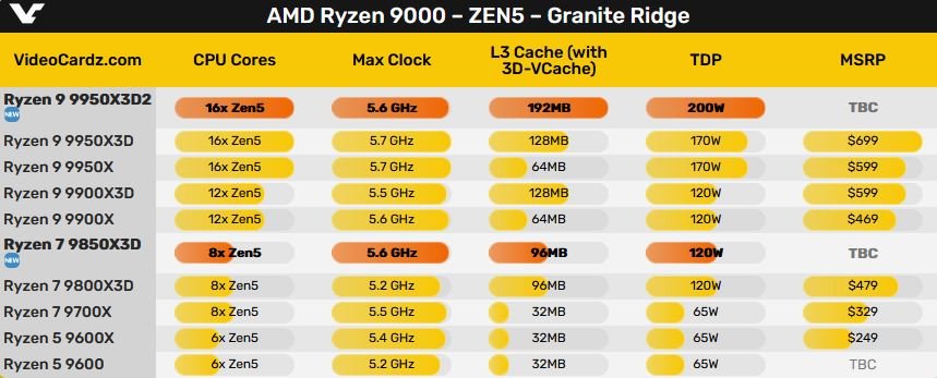 De acordo com o pessoal da página videocardz, a AMD pretende lançar dois novos processadores Ryzen 9000X3D. Eles mencionaram os modelos Ryzen 9 9950X3D2 e Ryzen 7 9850X3D, e o com final X3D2 supostamente tem 3D V-Cache duplo.