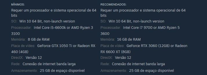 Se você quiser jogar pelo menos no mínimo precisa ter um processador parecido com oIntel Core i5-6600k ou AMD Ryzen 3 3100, 8 GB de RAM e uma placa de vídeo parecida com a GeForce GTX 1050 Ti ou Radeon RX 460 (4GB).