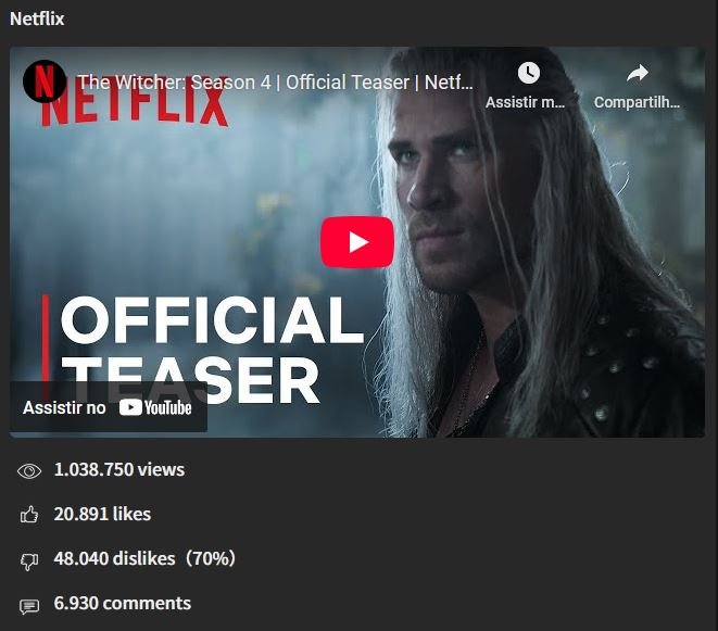 A Netflix divulgou em seu canal oficial do YouTube o trailer da quarta temporada da série The Witcher. Mas aparentemente os fãs não gostaram muito, pois o vídeo está com muitos dislikes e comentários negativos.